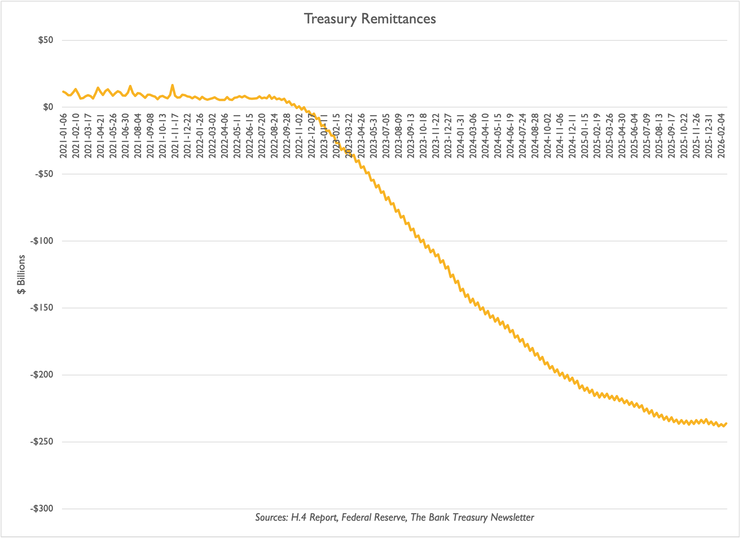 But even if the Fed were not rebuilding its SOMA portfolio by buying Treasurys, the composition of its liabilities would leave it with little room to reduce assets because the liabilities that balance its $6.3 trillion SOMA portfolio include currency in circulation (Slide 5), which this year surpassed $2.4 trillion. Over the past 15 years, since Kevin Warsh resigned as a Fed governor, the average balance in the Treasury's "checking" account at the Fed (Treasury General Account (TGA)) has grown from less than $100 billion to surpassing $900 billion this month (Slide 6). It still earns less on its SOMA portfolio than it pays interest to banks for their reserve deposits, which cumulatively added nearly $240 billion to reserve deposits (Slide 7) through negative Treasury remittances. Even with the offset, higher-trending balances in the Treasury's TGA account, especially over the last six months, explain why reserve deposits (Slide 8) are down since the summer to their lowest level since the Fed began quantitative tightening in June 2023.