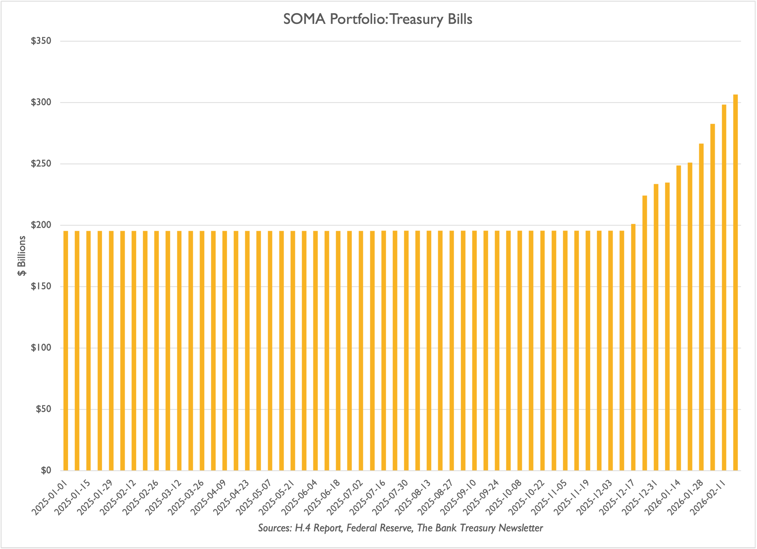 Former Fed governor Kevin Warsh, the President's nominee to chair the Fed, is not a fan of the Fed's balance sheet size and has suggested he would work toward a new Treasury Accord to reduce it. However, the balance sheet today leaves little room for shrinking it. Indeed, its System Open Market Account (SOMA) portfolio began growing again this year (Slide 2), driven by the Fed's decision to expand its holdings of Treasury Bills (Slide 3), which is offsetting the run-off from its Agency MBS holdings (Slide 4).