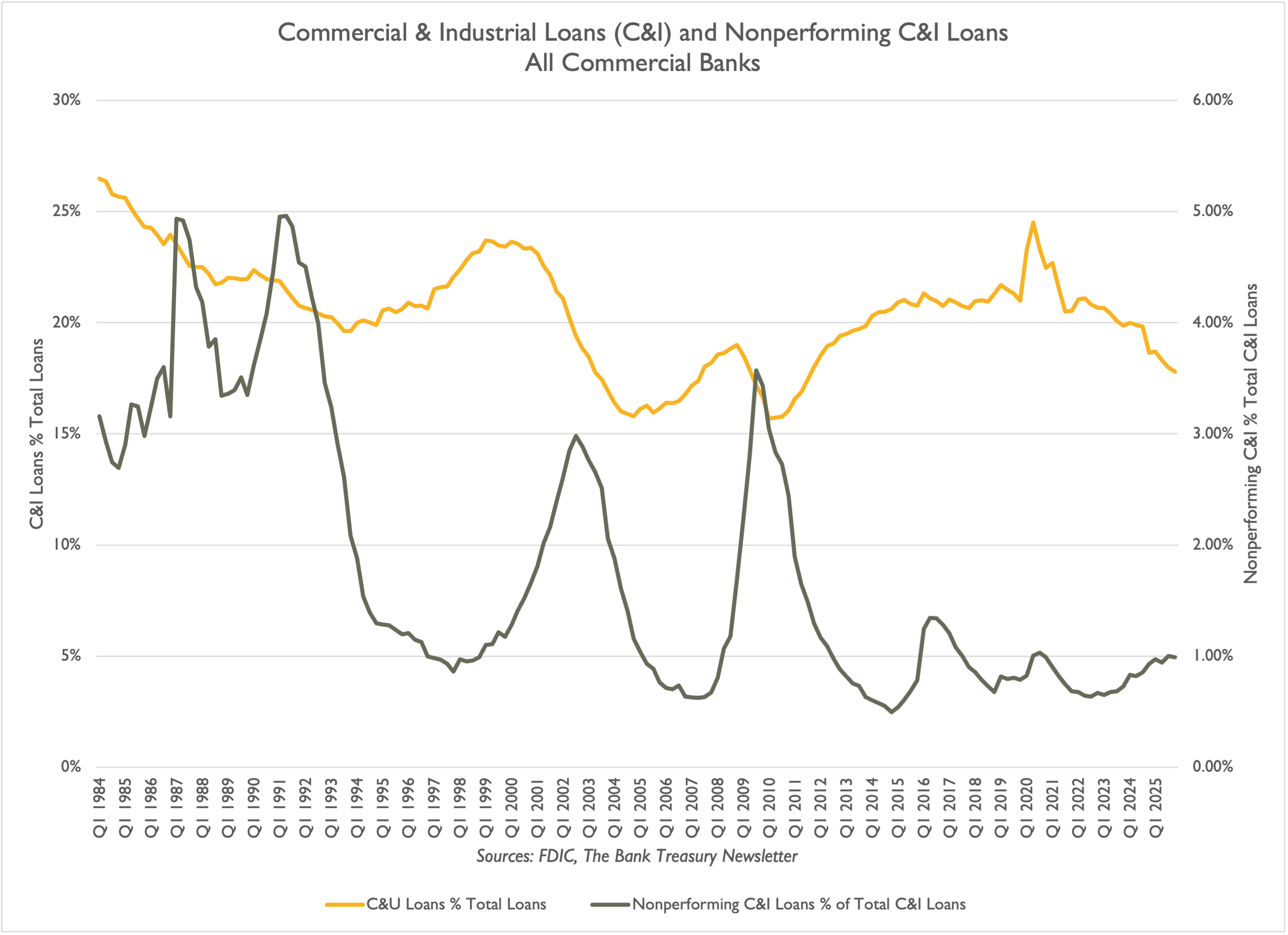 Bank executives are optimistic about making loans this year, but FDIC data shows that last year's most active lending was to non-deposit financial institutions. Commercial and industrial lending is flat and shrinking as a percentage of total loans. However, credit risk remains benign.