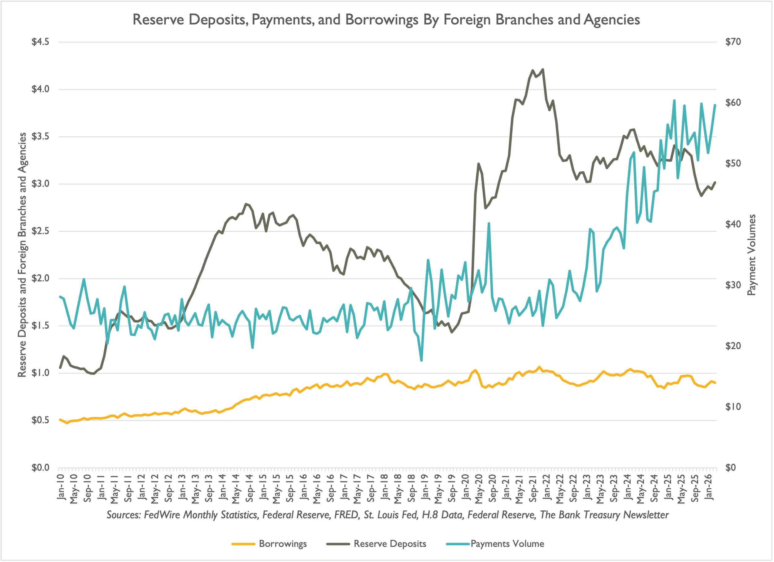 Bank treasurers may recall that after the Fed began paying interest on reserve deposits, foreign branches and agencies began leaving their cash at the Fed and arbitraging the interest earned against their borrowed funds in the Fed funds market, which in the 2010s ran a few basis points below IORB. Researchers at the New York Fed showed that in the decade after the Fed launched Quantitative Easing, payment volumes moved in line with the supply of reserves, and as the Fed increased reserves, payment volumes rose. But this relationship has been less clear since 2020, as the graph in Figure 3 shows: Borrowing by foreign branches and agencies in the Fed funds market, according to H.8 data, has been flat, even as reserves more than doubled and payment volumes soared.