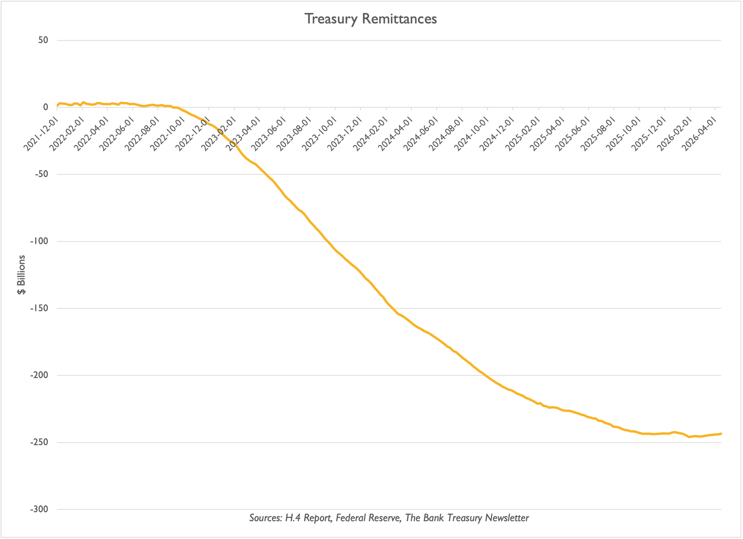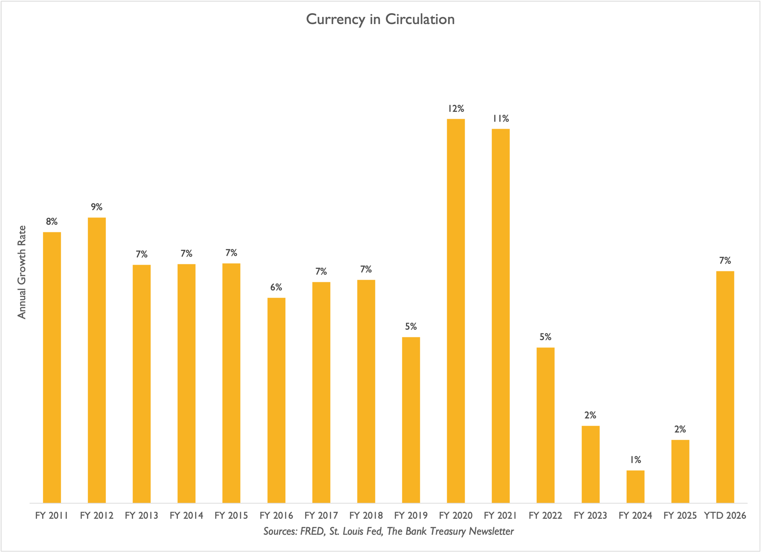 Negative Treasury remittances flattened out this year as the Fed broke even between the interest it earned on its bond portfolio and the interest it paid on reserves. However, the Fed still owes $260 billion to the U.S. Treasury due to negative remittances. Repaying these reduces reserve deposits. Currency, equal to $2.5 trillion, grew by 1% in FY 2024 and 2% in FY 2025, but leaped to 7% YTD in 2026. Every dollar of printed currency decreases reserves equally.