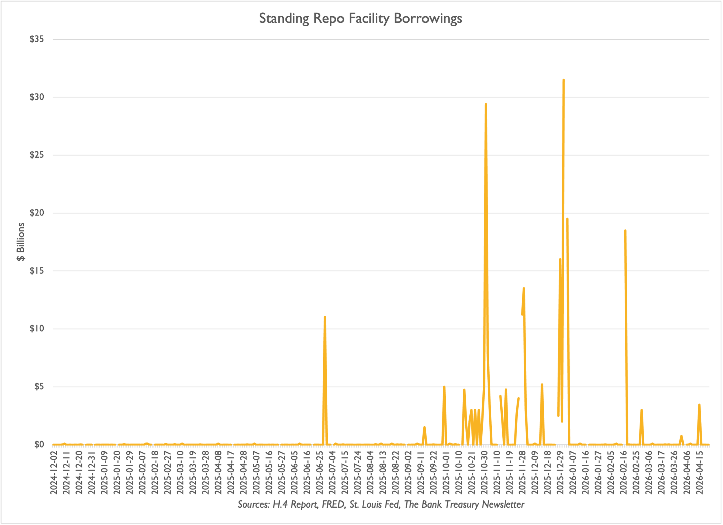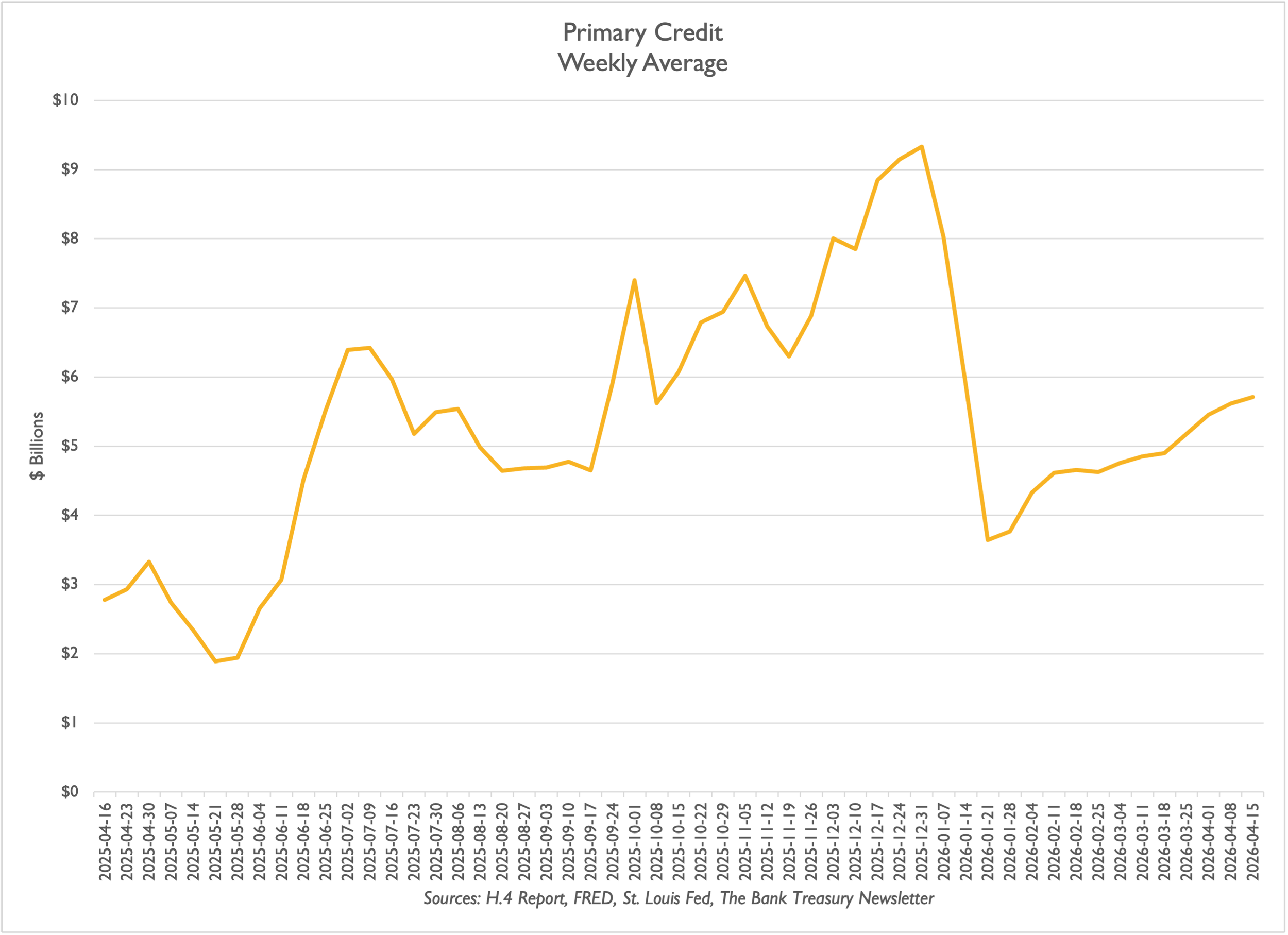 The stigma of borrowing from the Fed as a last resort discourages bank treasurers from using it for contingency funding, even as Primary Credit borrowings are up by $2 billion since the war began, to nearly $6 billion (Slide 4). The Standing Repo Facility (SRP), providing emergency funding to banks and nonbanks (Slide 5), has also seen increased use over the last six months.
