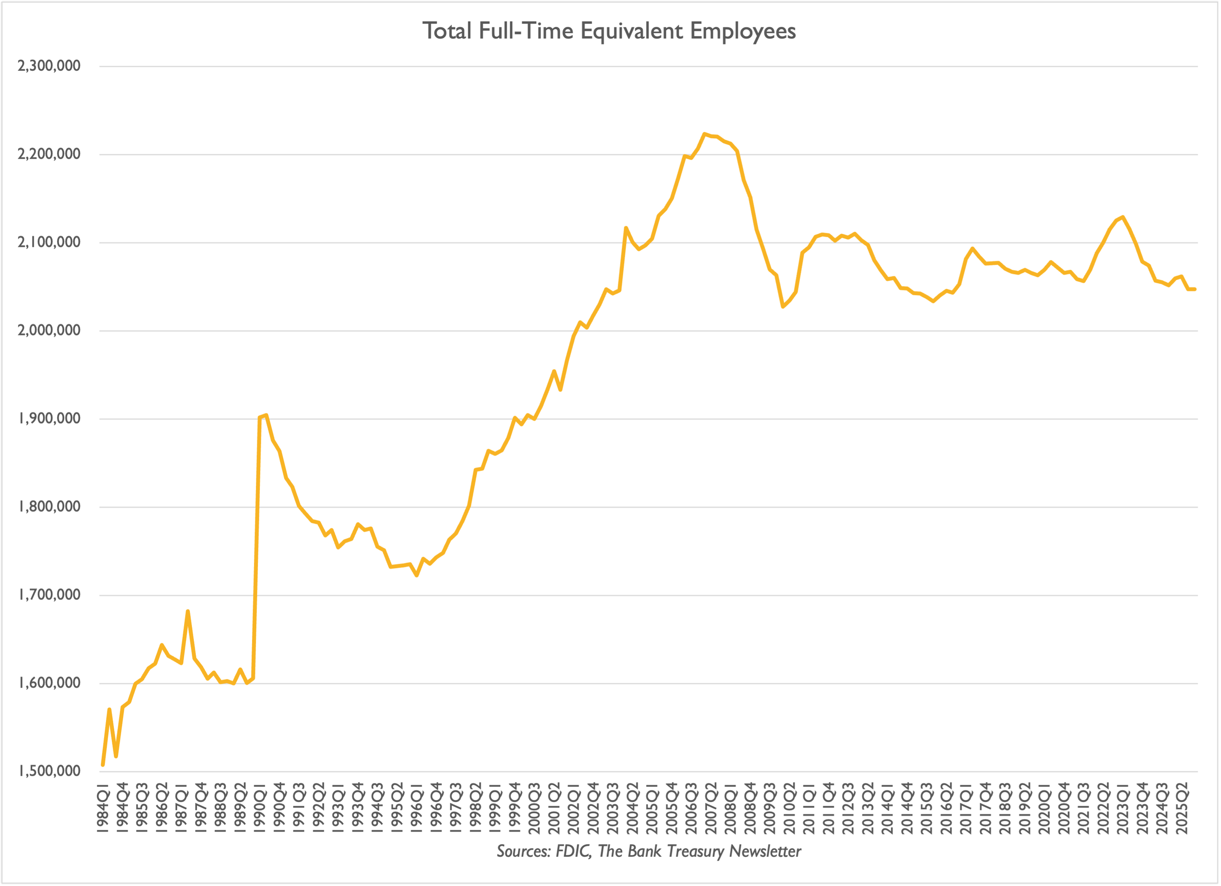 Bank executives claim AI reduces headcount and boosts productivity, but FDIC data (Slide 10) shows no decline. Headcount peaked before the Global Financial Crisis at over 2.2 million and has stayed flat at 2.1 million, despite the number of banks halving in 20 years (from 8,680 to 4,336).