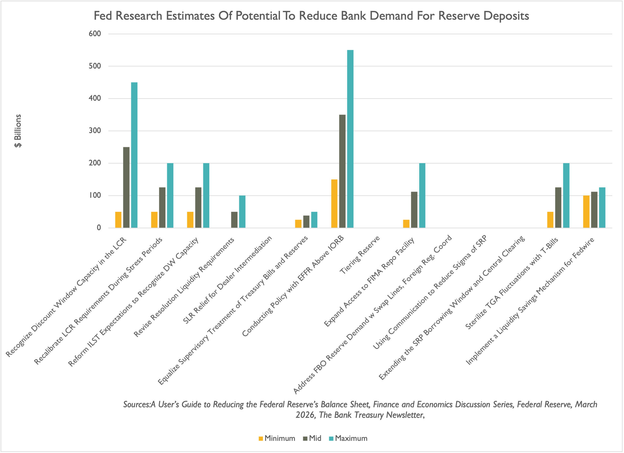 One main reason bank treasurers might hold more reserves than required is to cover payments. If the Fed and Treasury want to reduce the Fed’s balance sheet, figuring out how to reduce the supply of reserves to support payments is key. Some of their ideas include moving payments on FedWire to a batch system, such as that used by the Automated Clearing House, which processes payments in a day rather than by the minute. They would also introduce Liquidity Savings Mechanisms (LSMs), which would allow banks to send payments without reducing their reserve balances on an intraday basis, as other central banks do in their payment systems. Fed researchers believe that LSMs could cut demand for reserves by as much as $125 billion, although, like the rest of their ideas, they remain untested in a system as large as the U.S. dollar.