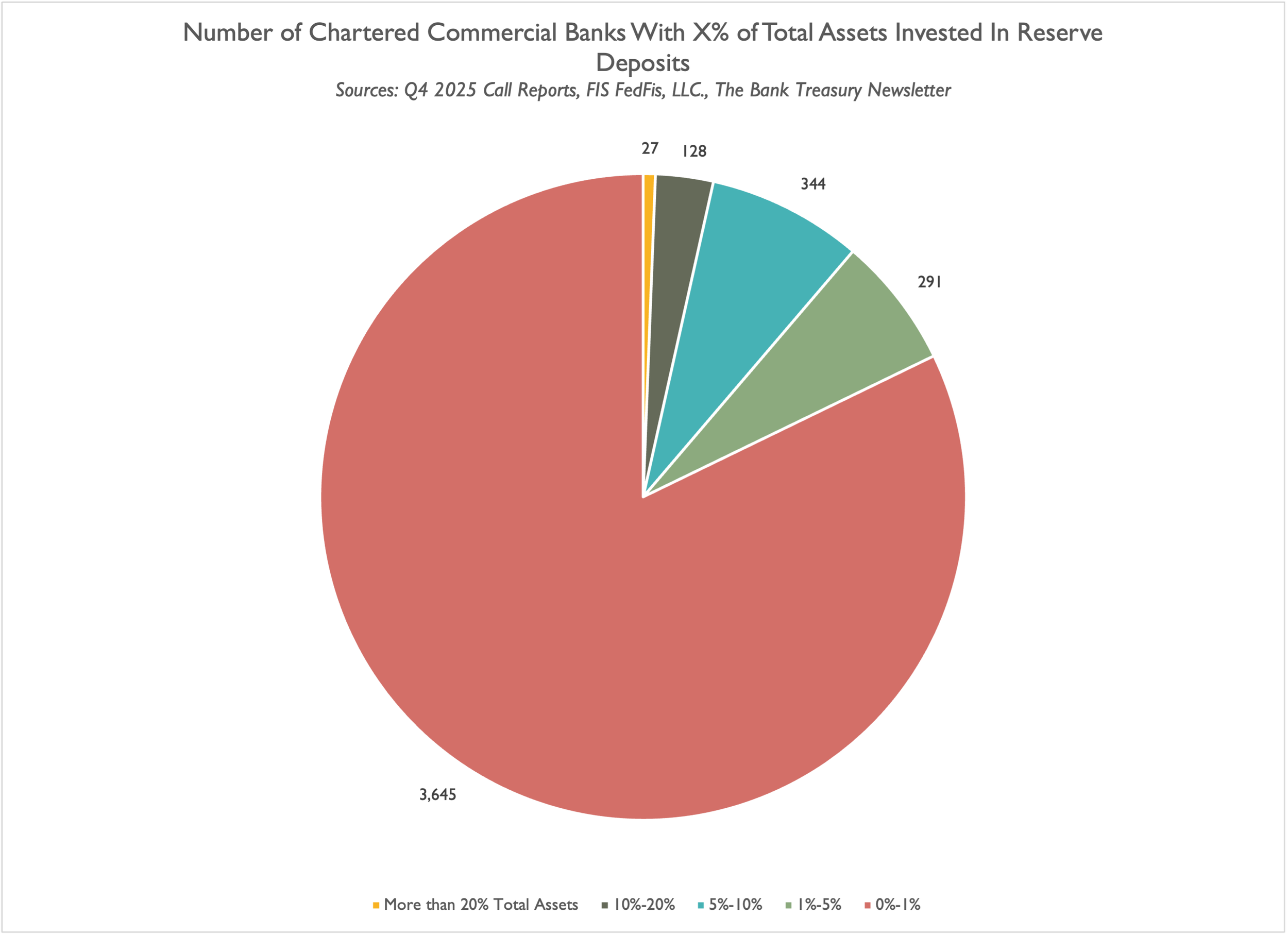 Strictly speaking, there are no narrow banks chartered to operate in the U.S. banking system. In aggregate, reserve deposits held by domestic banks at the Fed, according to the Q4 2025 call reports, amounted to 6% of their total assets, but a few dozen banks, ranging from small community banks to some global banks, hold multiples of that at the Fed. Holding the entire balance sheet at the Fed does not exist.