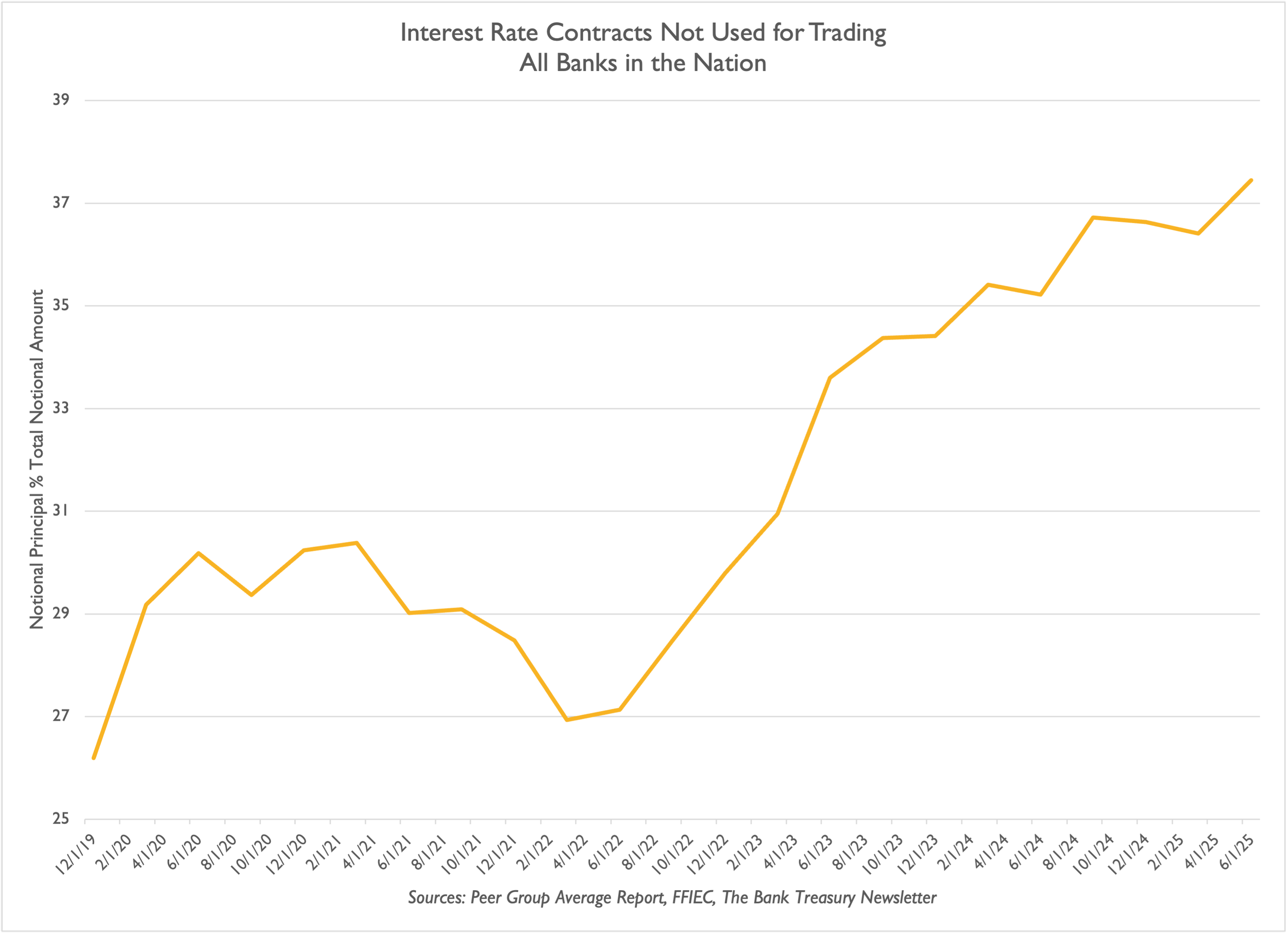 Even as the industry has been repricing its time deposits lower all year, depositors continue to roll and add cash to their accounts. Total assets funded with time deposits maturing in less than one year increased from 12% in 2022 to 22% this last quarter, a 13-year high (Slide 7). Demand deposits as a percent of total deposits, at 25%, is unchanged over the previous four quarters, a remarkable streak compared to its history over the past 25 years (Slide 8) which has been more volatile. As their deposit funding pressures eased in the last year, bank treasurers let some of their short-term borrowings from the Federal Home Loan Banks run off, but that trend seems to have flattened out in Q2 2025 (Slide 9). Finally, bank treasury hedging activity, measured by the notional principal of interest rate swaps not used for hedging (Slide 10), continued to increase last quarter.