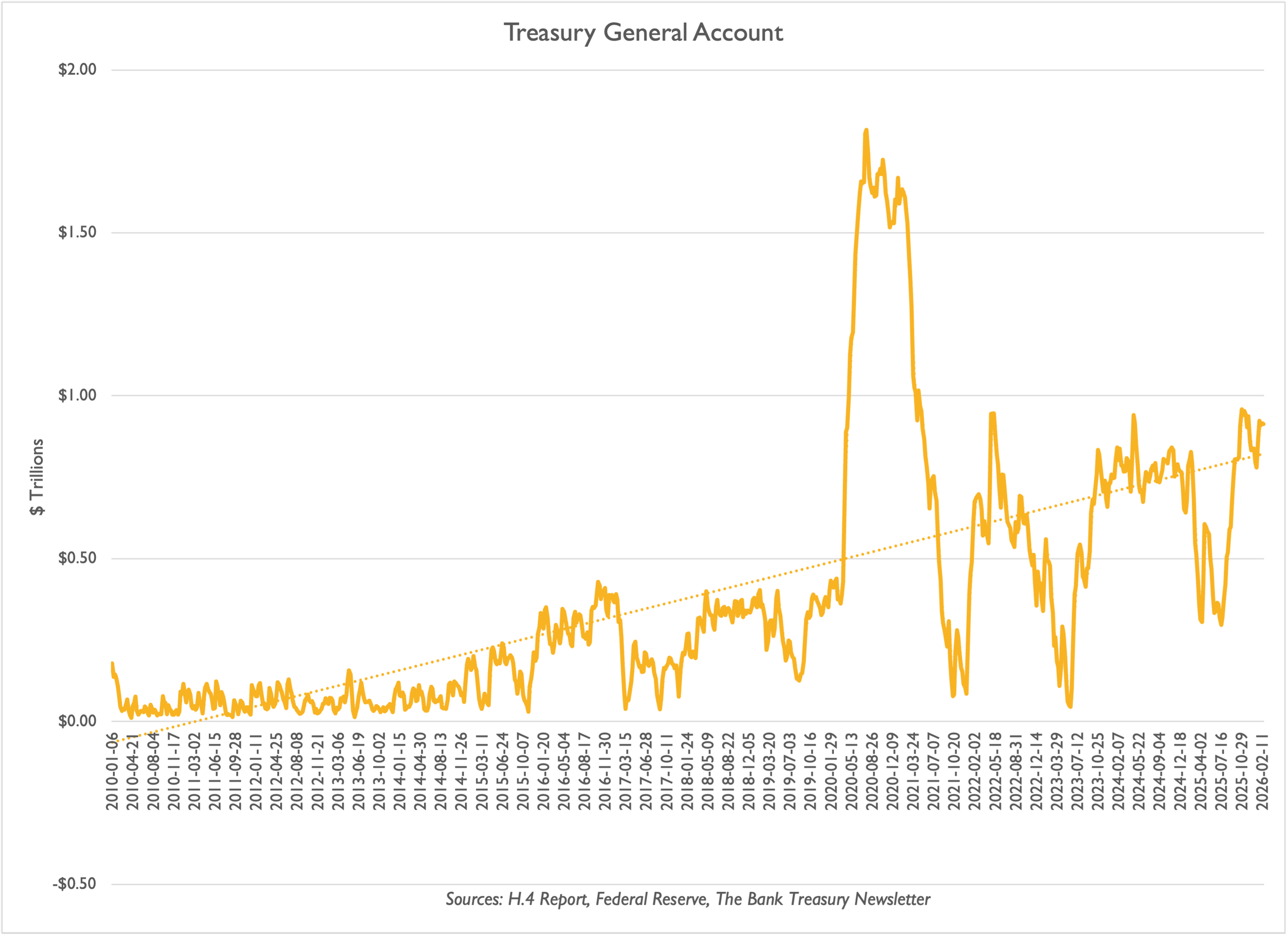 But even if the Fed were not rebuilding its SOMA portfolio by buying Treasurys, the composition of its liabilities would leave it with little room to reduce assets because the liabilities that balance its $6.3 trillion SOMA portfolio include currency in circulation (Slide 5), which this year surpassed $2.4 trillion. Over the past 15 years, since Kevin Warsh resigned as a Fed governor, the average balance in the Treasury's "checking" account at the Fed (Treasury General Account (TGA)) has grown from less than $100 billion to surpassing $900 billion this month (Slide 6). It still earns less on its SOMA portfolio than it pays interest to banks for their reserve deposits, which cumulatively added nearly $240 billion to reserve deposits (Slide 7) through negative Treasury remittances. Even with the offset, higher-trending balances in the Treasury's TGA account, especially over the last six months, explain why reserve deposits (Slide 8) are down since the summer to their lowest level since the Fed began quantitative tightening in June 2023.