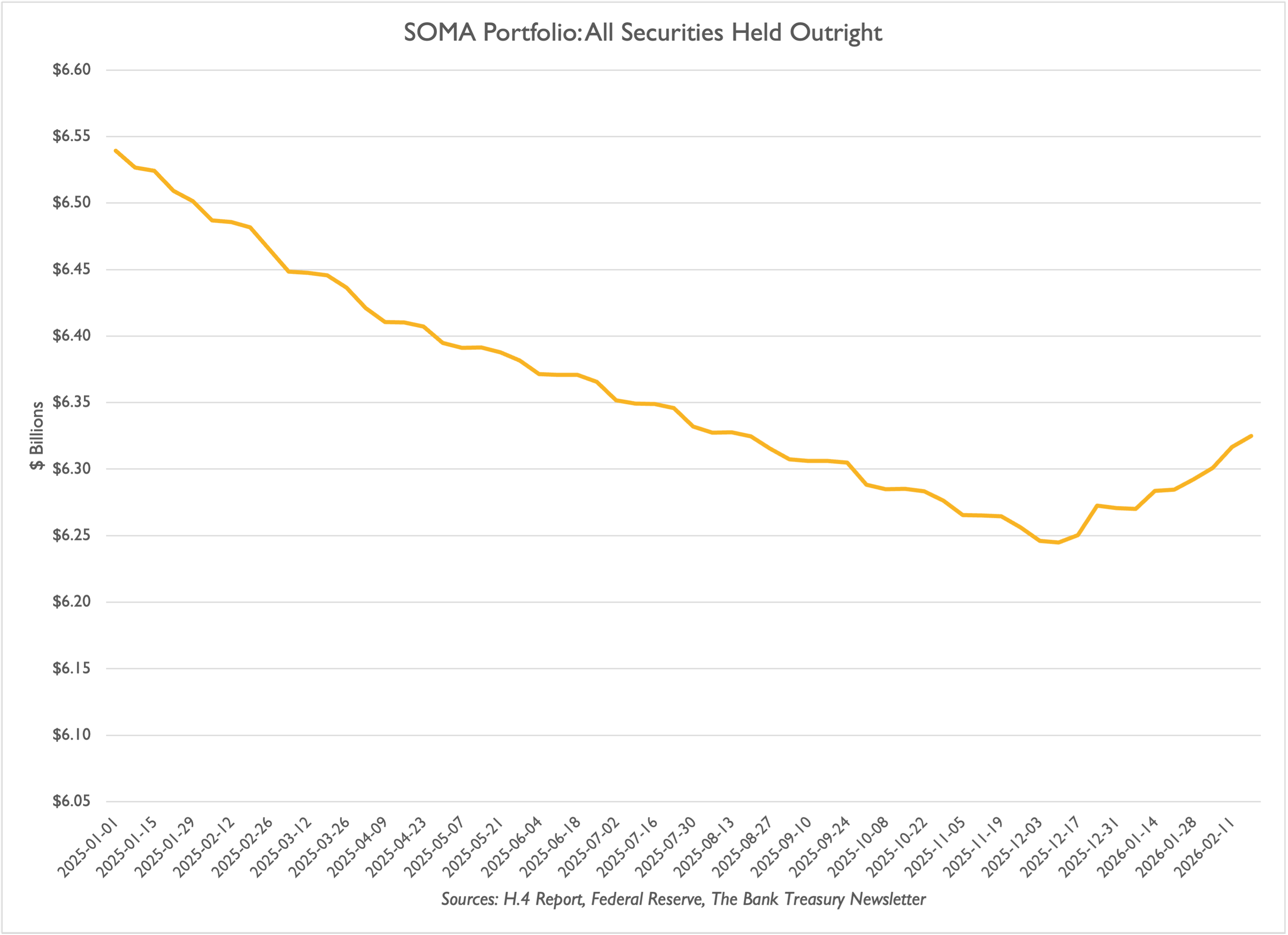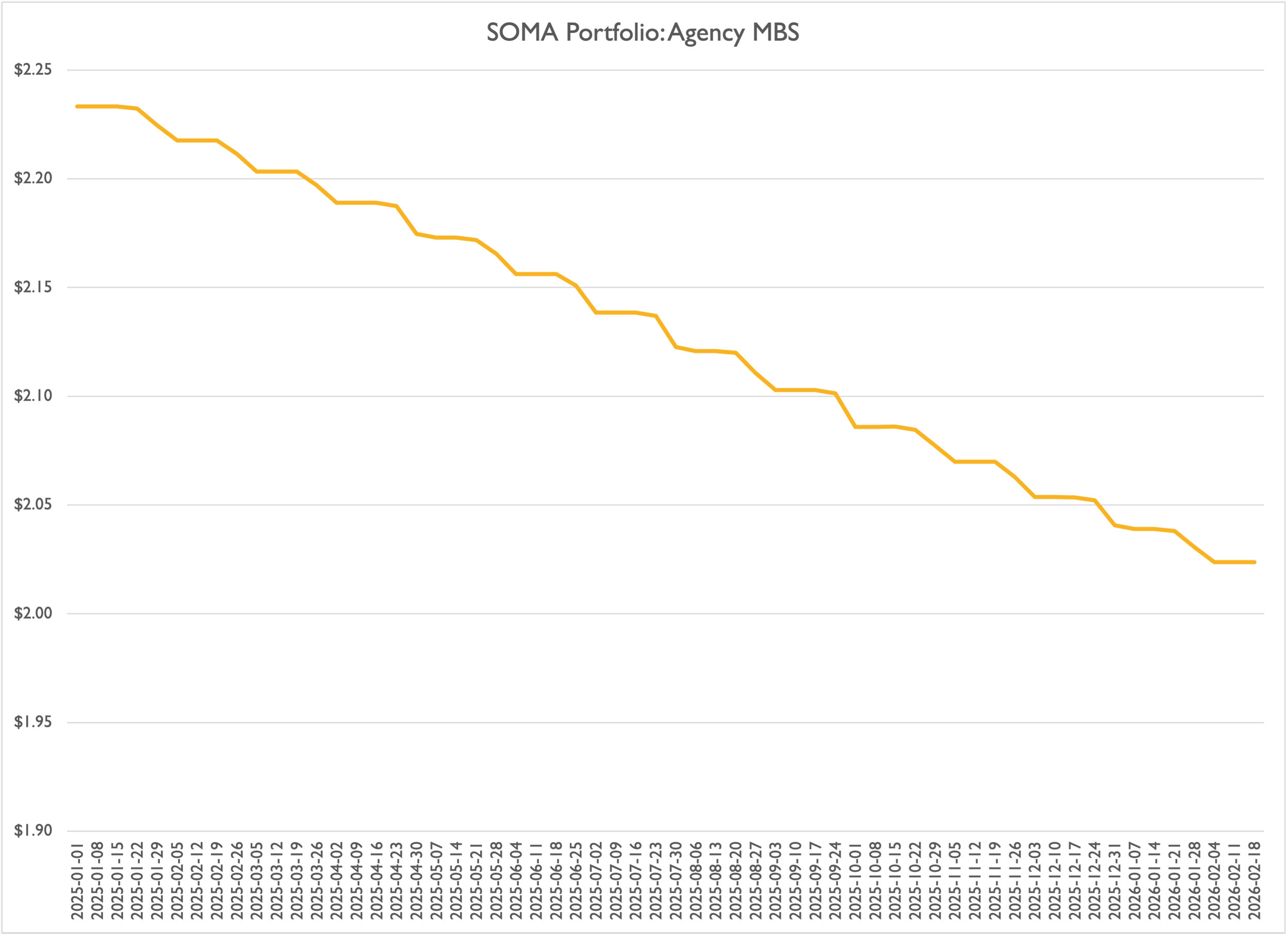 Former Fed governor Kevin Warsh, the President's nominee to chair the Fed, is not a fan of the Fed's balance sheet size and has suggested he would work toward a new Treasury Accord to reduce it. However, the balance sheet today leaves little room for shrinking it. Indeed, its System Open Market Account (SOMA) portfolio began growing again this year (Slide 2), driven by the Fed's decision to expand its holdings of Treasury Bills (Slide 3), which is offsetting the run-off from its Agency MBS holdings (Slide 4).