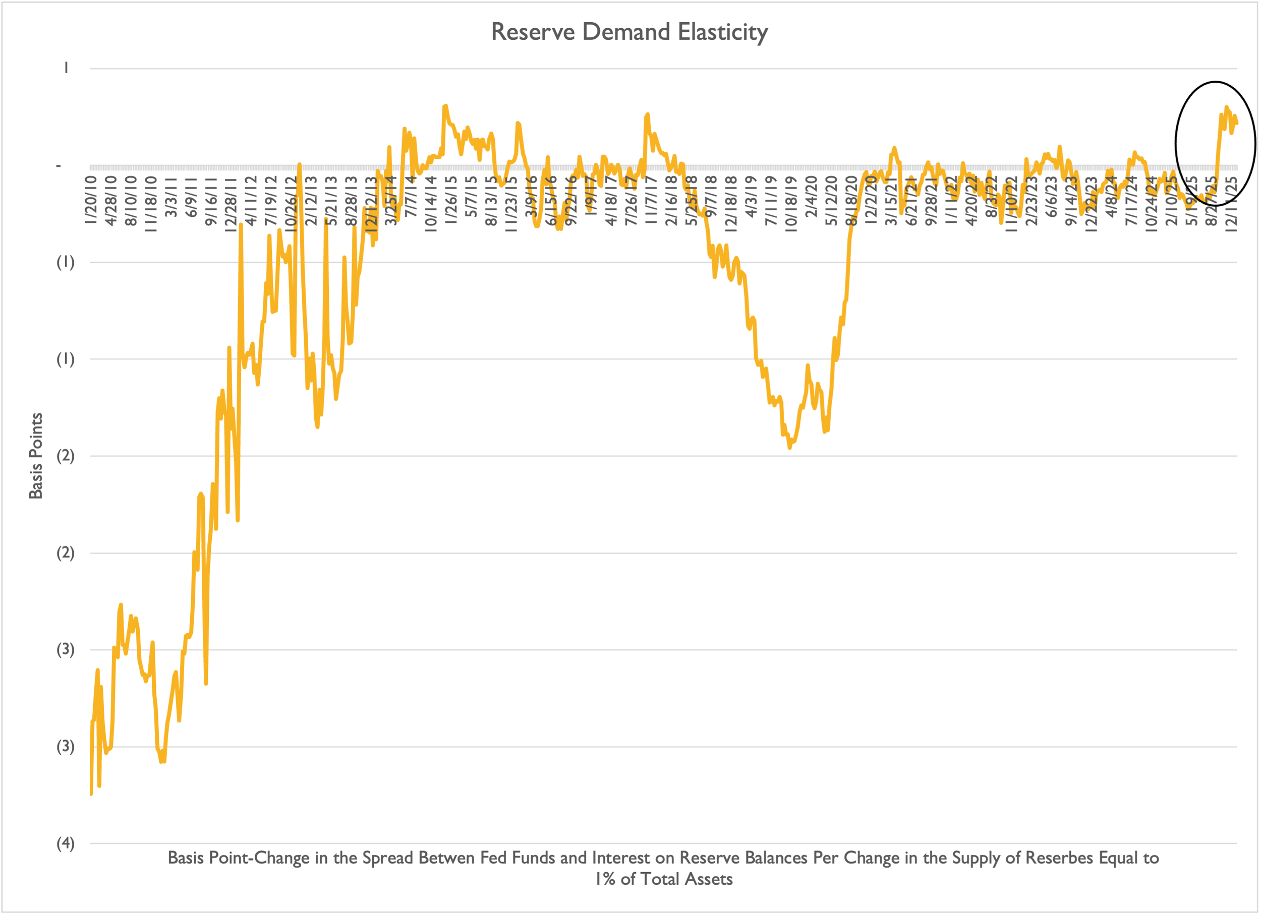 Critically, the Fed's balance sheet has little room, if any, to shrink as detailed in this month’s chart deck. Its System Open Market Account (SOMA) portfolio equals $6.3 trillion, including $4.3 trillion Treasurys and $2.0 trillion Agency Mortgage-Backed Securities. At $2.4 trillion, the supply of paper money printed by the Fed and one of the largest liabilities on its balance sheet compares to the $1.0 trillion in circulation when Kevin Warsh was governor. In addition, the Treasury's checking account is $0.9 trillion, leaving the Fed with a $3.0 trillion reserve deposit balance, which is three times the balance that existed when he resigned in 2011 to return to the private sector. Nevertheless, reserve demand elasticity, a measure the Fed calculates to describe the supply of reserves in the financial system, suggests there is little room to shrink reserves. Add to this, Fed economists, by their own analysis, believe that the Securities and Exchange Commission (SEC) 's mandate, going into effect next year, which will require dealers to centrally clear all Treasury and repo trading, will increase demand for reserves and thus leave the Fed with no room to shrink its balance sheet at all.