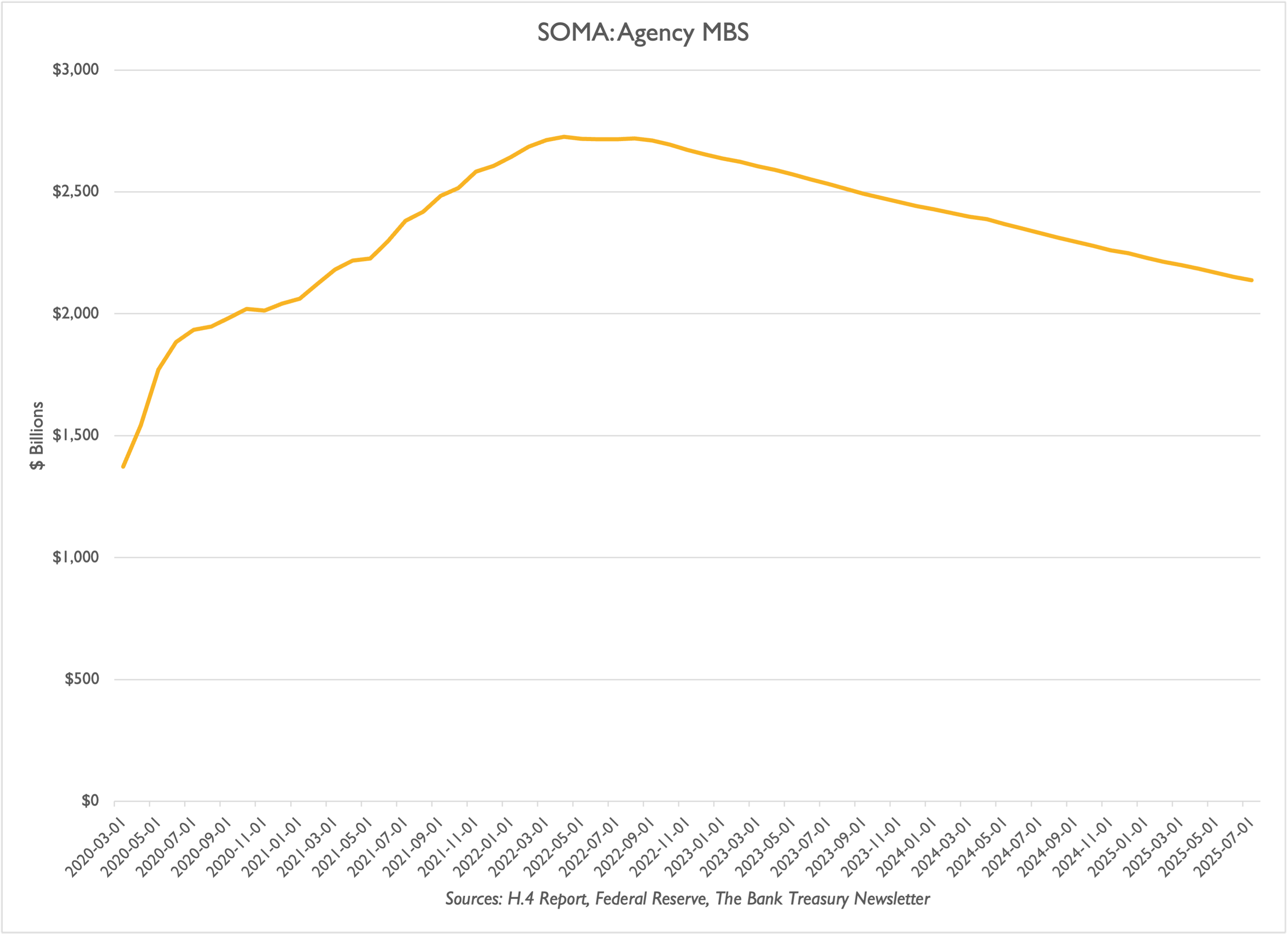 On the left, the Fed’s SOMA portfolio is virtually its entire total assets leaving aside the $7 billion balance in discount window loans, which includes a $1.4 billion balance in Paycheck Protection Program loans, the $11 billion in gold stock it keeps in its basement vault at the New York Fed, and an assorted list of other items including what the Fed estimates as $53 billion in coins lost and forgotten in someone’s cushion. Based on recent comments by Fed officials, the Fed likely plans to continue to let the size of its SOMA portfolio of Treasurys and Agency MBS run off at $5 billion and $35 billion per month, respectively. The Agency MBS portfolio, however, is running off at half that rate, for total monthly QT outflows equaling $20-$25 billion.