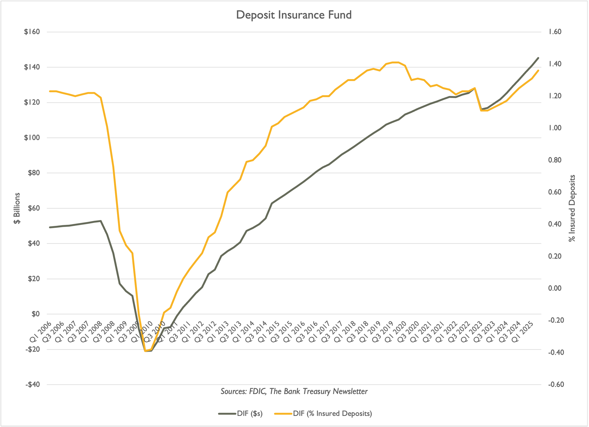 But either way, the numbers are the numbers--insured deposits equaled $11 trillion last quarter, compared to total liabilities which equaled $22 trillion, so if the denominator changes, so will the ratios. The FDIC also sets a target ratio for the DIF to achieve, called the DRR, which it set at 2% of insured deposits; thus, the FDIC would need to revise it, as well. But regardless, the FDIC intends to grow the DIF through regular assessments for the foreseeable future, even after it ends its special assessments by 2028.