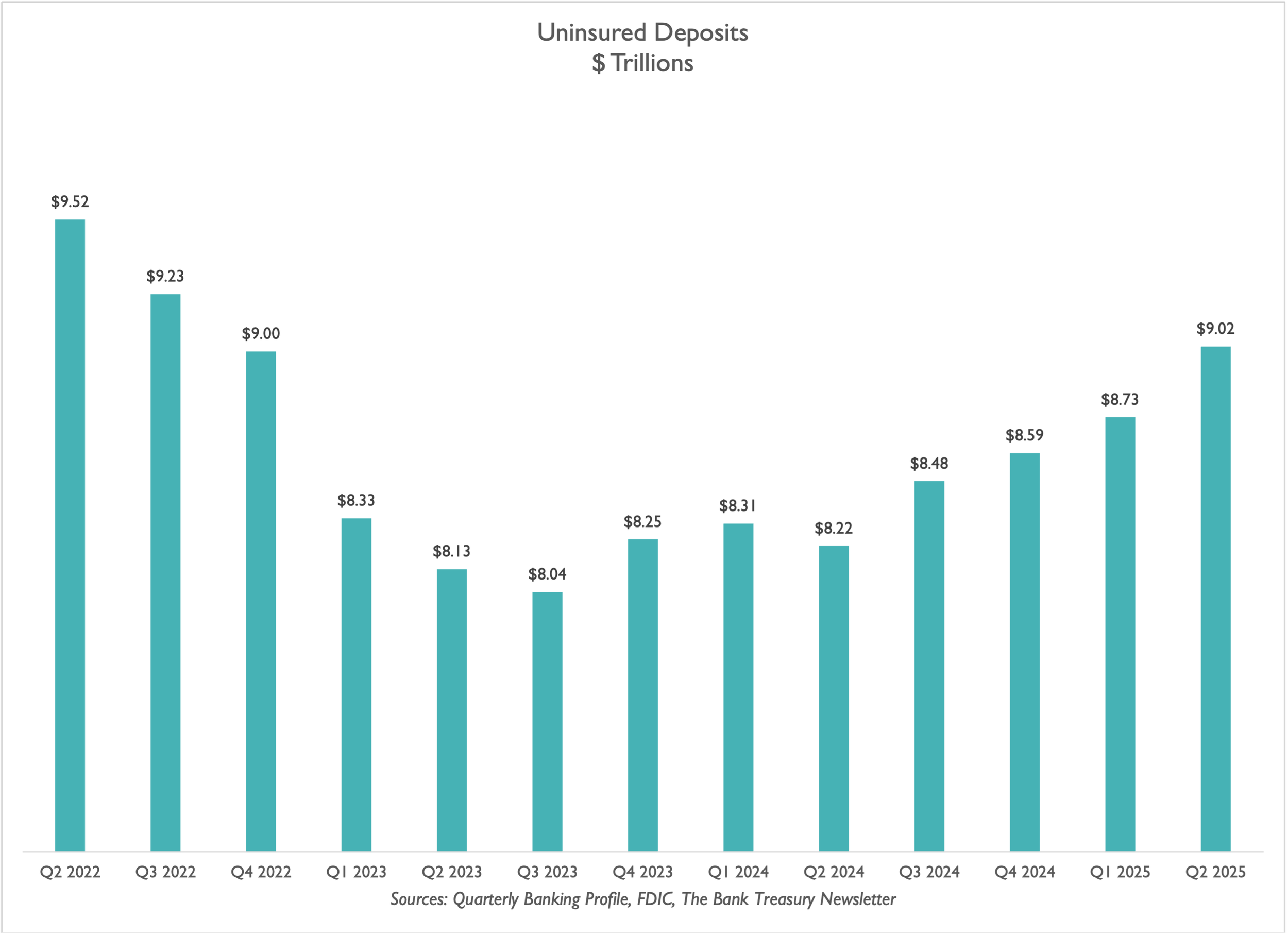 The average uninsured deposit balance according to call reports was $2 million in Q2 2025, and in aggregate, total uninsured deposits equaled $9 trillion, compared to insured deposits, which equaled $11 trillion. But while total domestic deposits grew by 4% in the last year, insured deposit growth is flattening. Indeed, if present trends continue, insured deposits could even shrink.